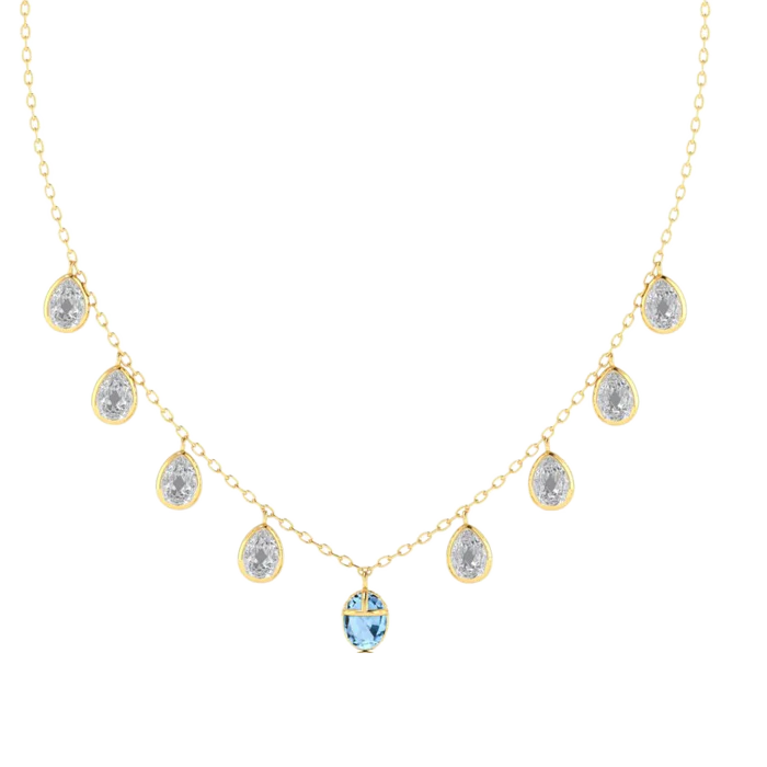 Our take on a beautiful topaz stone with a scarab outline in the form of a stunning 18 karat gold necklace with 8 clear crystals set in a gold outline.