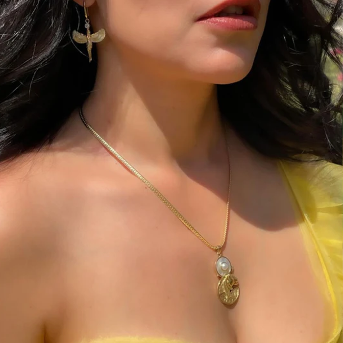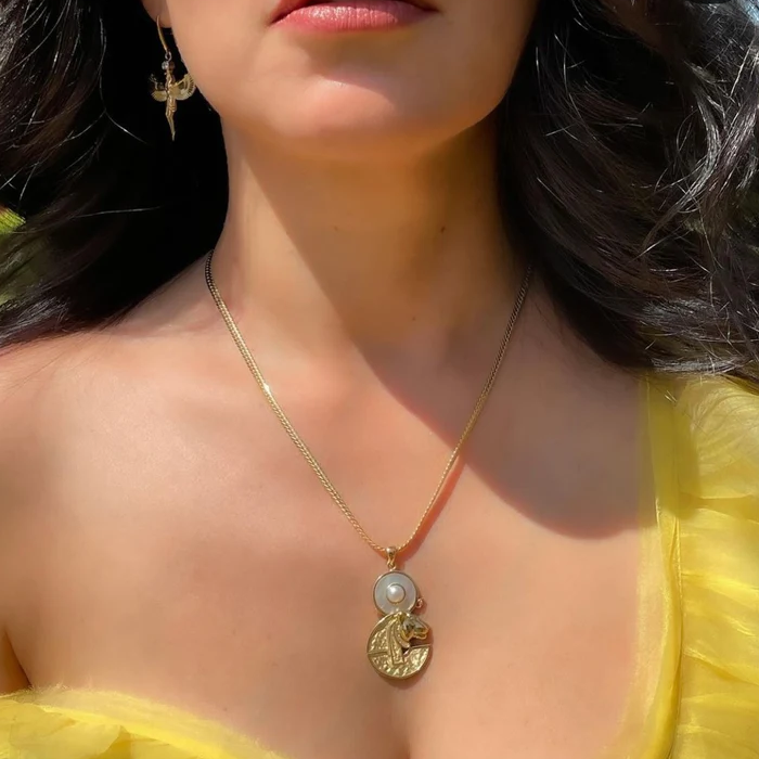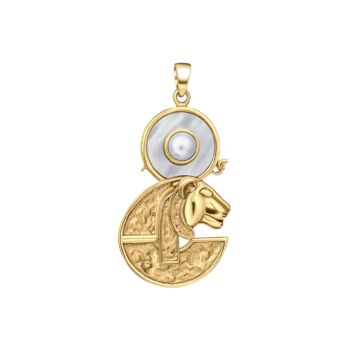 This beauty is now available in 18k gold with stunning mother of pearl embedded in her sun disk along with a single pearl or a Citrine in the middle if you choose.