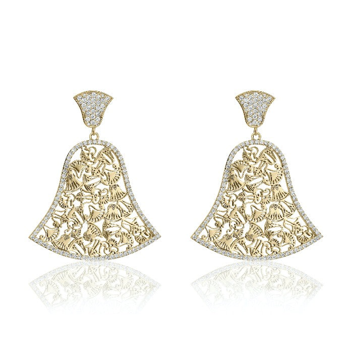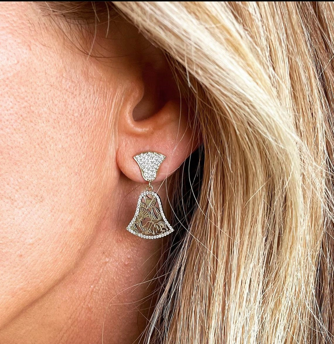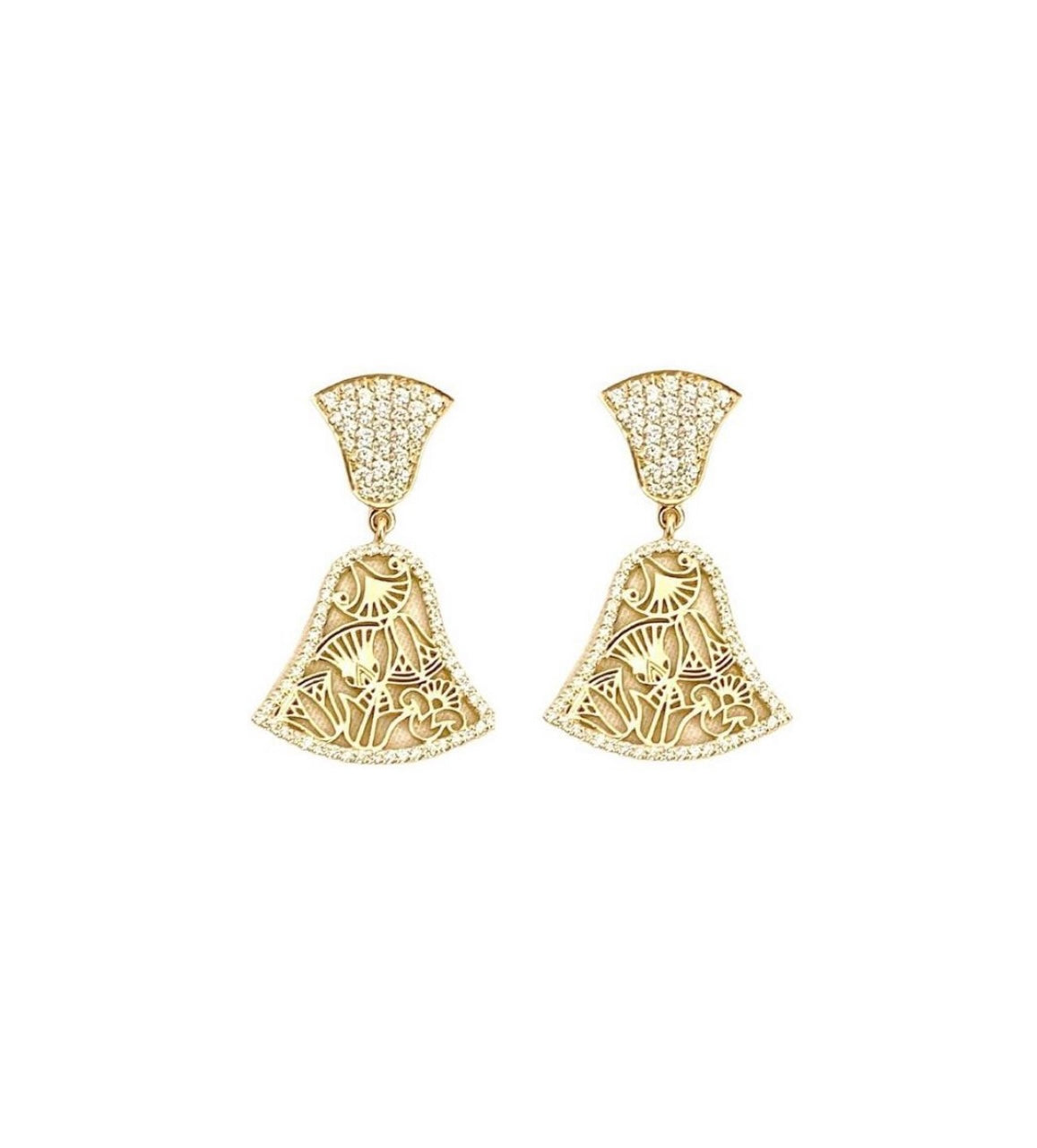 The stud on the earring is full Diamond pavé with the outline of the big lotus in pavé as well. Inside the main Lotus are 27 different lotus designs places intricately and with a lot of thought and placement by the designer to create this masterpiece.